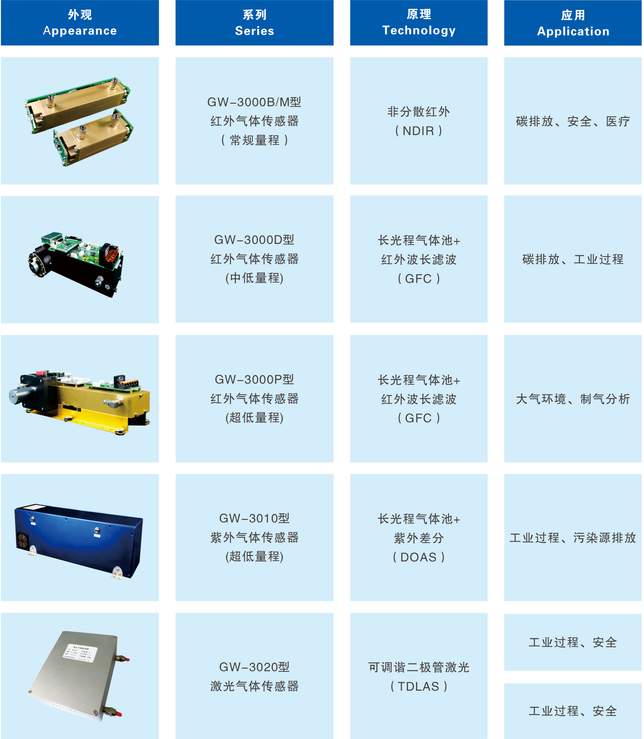 敢為科技擁有非分散紅外氣體檢測(cè)技術(shù)、紫外(紅外)差分吸收光譜技術(shù)、紅外氣體相關(guān)濾波檢測(cè)技術(shù)等多種光電檢測(cè)、光譜分析技術(shù),在這些技術(shù)基礎(chǔ)上我們研制了可用于碳排放檢測(cè)、污染源監(jiān)測(cè)、工業(yè)過(guò)程氣體分析、室內(nèi)空氣質(zhì)量檢測(cè)、空分用低濃度檢測(cè)等多個(gè)應(yīng)用領(lǐng)域的氣體傳感器,可測(cè)量CO、CO2、CH4、N2O等多種氣體,型號(hào)全、種類(lèi)多。