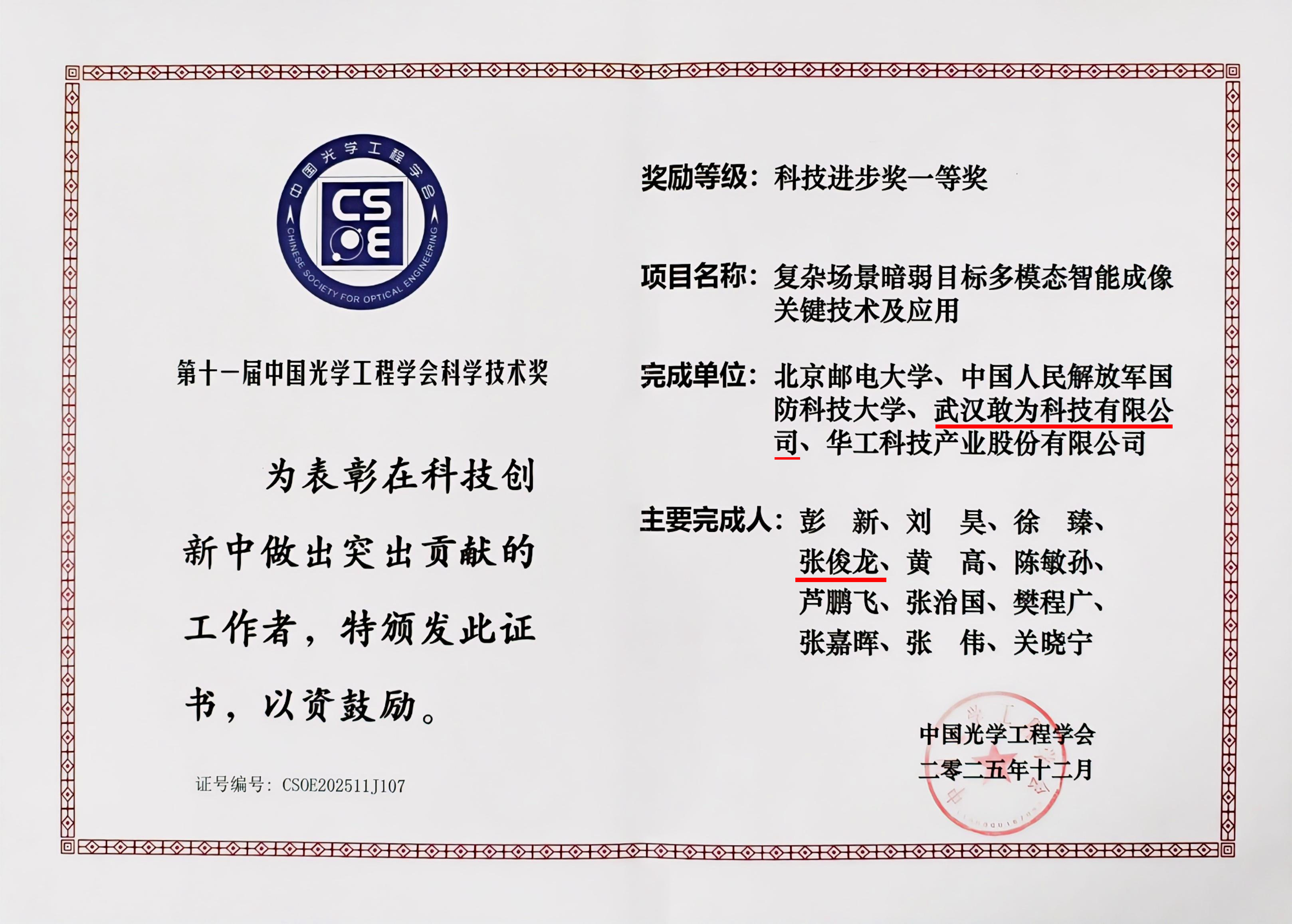 近日,我國光學工程領(lǐng)域權(quán)威獎項——第十一屆“中國光學工程學會科學技術(shù)獎”獲獎名單正式公布。敢為科技與北京郵電大學、中國人民解放軍國防科技大學、華工科技產(chǎn)業(yè)股份有限公司組成的項目團隊,憑借“復雜場景暗弱目標多模態(tài)智能成像關(guān)鍵技術(shù)及應(yīng)用”項目,榮獲科技進步獎一等獎。
