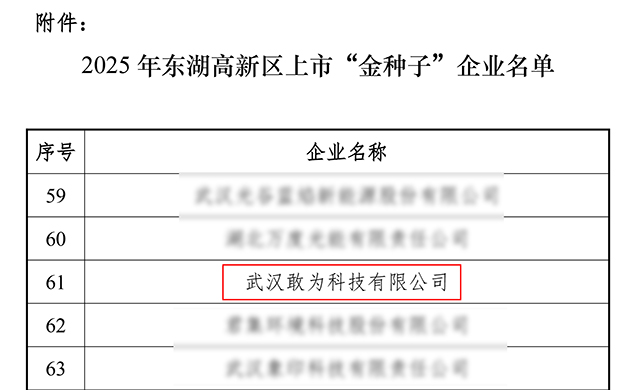 近日,武漢東湖新技術開發(fā)區(qū)金融工作局公布了《2025年東湖高新區(qū)上市“金種子”企業(yè)名單》,敢為科技憑借其卓越的創(chuàng)新實力與高成長潛力,成功入選該名單,成為新一批東湖高新區(qū)上市后備重點企業(yè)。